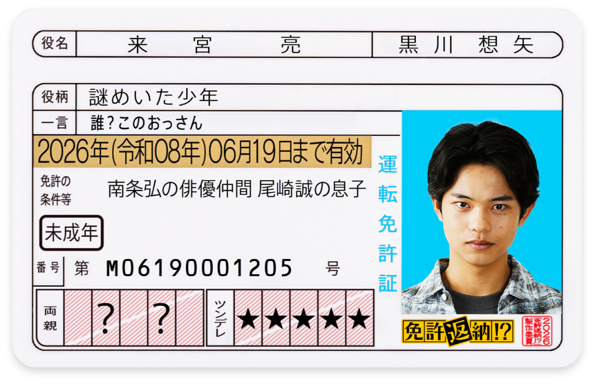 南条の俳優仲間・尾崎誠の息子であり、南条との出会いで大きく人生が変わっていく来宮亮(きのみや・りょう)役には黒川想矢が決定。