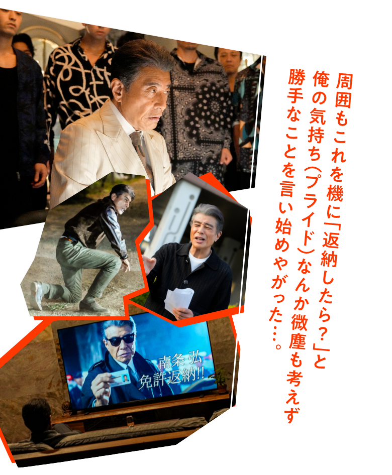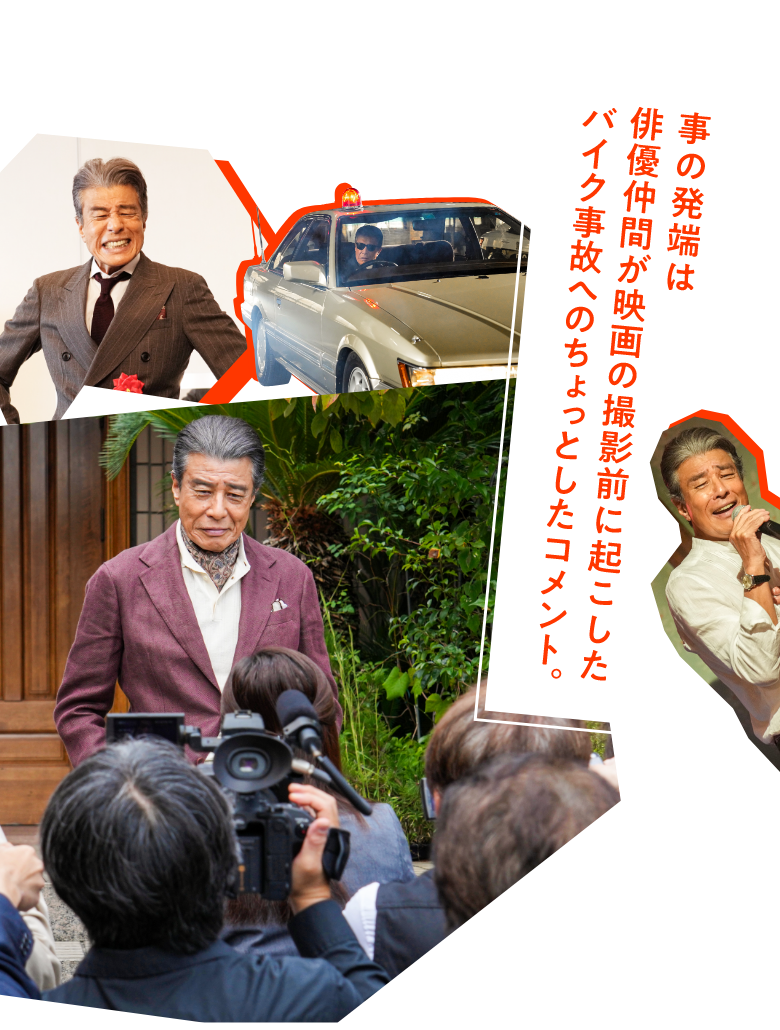 映画『免許返納!?』公式サイト 【2026年6月19日公開】舘ひろし史上最高のドタバタコメディが誕生!!ひょんなことから世論を巻き込み、返納を巡る大騒動!?“俺の免許、どうなっちゃうの!?” NEWS TRAILER COMMENTS TRAILER 特報 COMMENTS 南条弘 役 舘ひろし 初めにお話をいただいた際、目に飛び込んできたタイトルが「免許返納!」で、驚きました。 かつて、映画『免許がない!』で、教習所に通う俳優・南条弘というコミカルなキャラクターを演じてから、気づけば約30年の歳月が流れました。 そして、今、同じ“免許”をめぐる物語が、今度は『免許返納!?』という形で巡ってきました。 これは、私の俳優として歩んできた人生を象徴しているかのようで、運命めいたものを感じました。 脚本家・林さんが紡いだ軽やかで味わい深い脚本を元に、監督、プロデューサーと打ち合わせを重ね、次々とアイデアが湧き上がり、脚本の世界が広がっていきました。 劇中では、真っ赤なフェラーリに、「あぶない刑事」でもお馴染みのハーレーやレパードも登場し、カーアクションもあります。笑って泣ける、世代を問わず楽しんでいただける作品となっております。スクリーンで楽しんでいただけましたら幸いです。 監督 河合勇人 舘ひろしさん主演の映画を一緒に撮りませんか——その一言をプロデューサーから聞いた瞬間、身体が震えました。中学2年のあの日、友達と買ったEPレコード『泣かないで』。あの歌声と存在感に胸を撃ち抜かれ、【舘ひろし】という名前は僕の中で“永遠のヒーロー”になりました。その人と映画を撮れる。そんな奇跡みたいな話が、この歳になって本当に来るとは思っていませんでした。 ただ、テーマは“免許返納”。重たい社会問題と向き合いながら、舘さんの魅力と作品の熱量をどう両立させるか——正直、怖かった。でも、現場に立った舘さんは、僕の不安を一瞬で吹き飛ばしました。台本の「てにをは」まで徹底的に読み込み、毎朝のように驚くようなアイデアを投げかけ、こちらの想像を軽々と飛び越えてくる。 現場で「これが舘ひろしだ」と、何度心の中で叫んだことか。 劇中には、ハーレーに乗ってショットガンをぶっ放したり、往年の名曲をカラオケで歌ったり、憧れ続けた“あの舘ひろし”の瞬間を、遠慮なく、全力で詰め込みました。 それが“免許返納”というテーマとどう交差するのか—— その答えは、この映画の中にあります! プロデューサー 天野和人 「舘ひろしで免許返納をテーマにコメディをやりませんか?」と事務所から提案を受けた時、これだ!と思いました。ハーレーとショットガンが代名詞の舘ひろしが免許を取り上げられたらいつものダンディーがどのように崩れるのか……。河合監督の演出で、「誰も見たことのない舘ひろし」を堪能してもらったうえで、免許返納という社会の動きを優しく考える一助になるのではないか、と考えました。結果は、中身を見ていただければ分かります! NEWS 2025.12.17 ティザービジュアル&特報解禁! 映画『免許返納!?』の公開が2026年6月19日(金)に決定しました! さらに、カッコいいのにコミカル要素が満載のティザービジュアル&特報映像もあわせて解禁!! 映画スター・南条弘、70歳。芸術作品よりも、まだまだアクションがやりたいアクティブシニア俳優。 腐れ縁の俳優仲間が起こしたバイク事故を諫めるコメントがやたらと世間に持ち上げられ、いつの間にか周囲からはこんな声が…「で、南条さんはいつ“免許返納”するんですか?」 免許返納するつもりは毛頭ない主人公・南条弘を演じるのは、スター俳優・舘ひろし!! 監督・河合勇人&脚本・林民夫で、【舘ひろし史上最高】のドタバタコメディが誕生!! 今後の続報にも是非ご期待ください!! 特報
