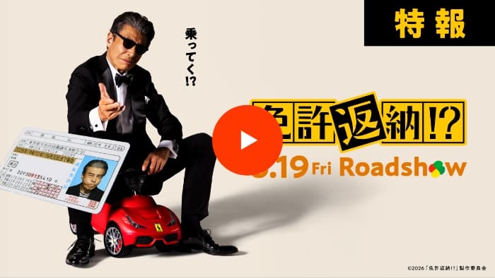 2025.12.17 ティザービジュアル&特報解禁! 映画『免許返納!?』の公開が2026年6月19日(金)に決定しました! さらに、カッコいいのにコミカル要素が満載のティザービジュアル&特報映像もあわせて解禁!! 映画スター・南条弘、70歳。芸術作品よりも、まだまだアクションがやりたいアクティブシニア俳優。 腐れ縁の俳優仲間が起こしたバイク事故を諫めるコメントがやたらと世間に持ち上げられ、いつの間にか周囲からはこんな声が…「で、南条さんはいつ“免許返納”するんですか?」 免許返納するつもりは毛頭ない主人公・南条弘を演じるのは、スター俳優・舘ひろし!! 監督・河合勇人&脚本・林民夫で、【舘ひろし史上最高】のドタバタコメディが誕生!! 今後の続報にも是非ご期待ください!!